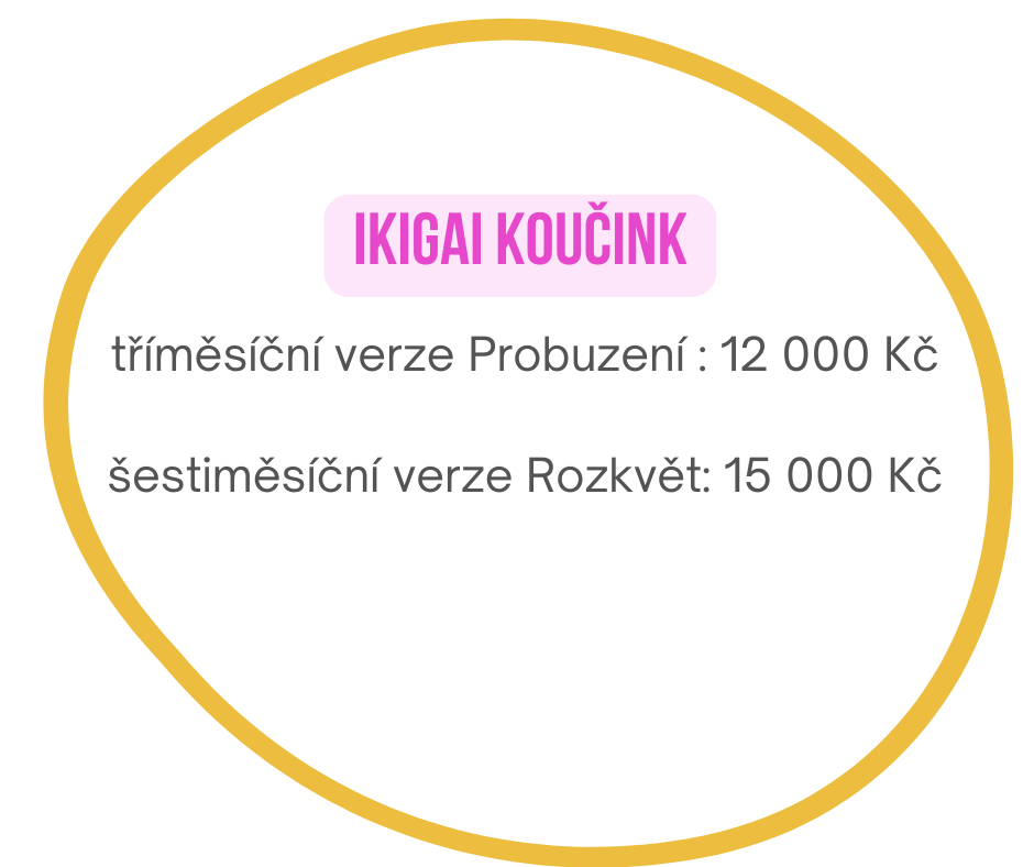 • Omluva 6 až 12 hodin před termínem je účtována 50 % ceny setkání (či poměrnou částí z ceny balíčku, resp. 5 % z celkové ceny ikigai procesu). Omluva v době kratší než 6 hodin je účtována v plné výši setkání (či poměrnou částí z ceny balíčku, resp. 10 % z celkové ceny ikigai procesu).