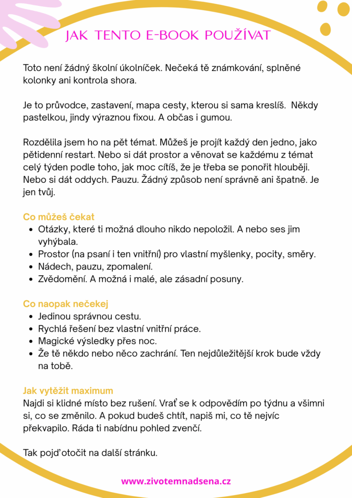 Není to jen další e-book, který si přečteš a založíš. Je to tvořivý pracovní sešit plný otázek, cvičení a prostoru pro tvoje myšlenky.