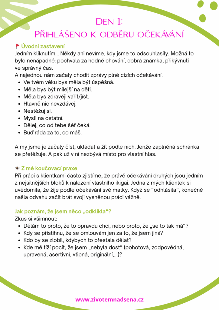 Každý den zabere asi 20-30 minut tvého času. Stačí tužka, vytištěný e-book a chuť být upřímná sama k sobě.